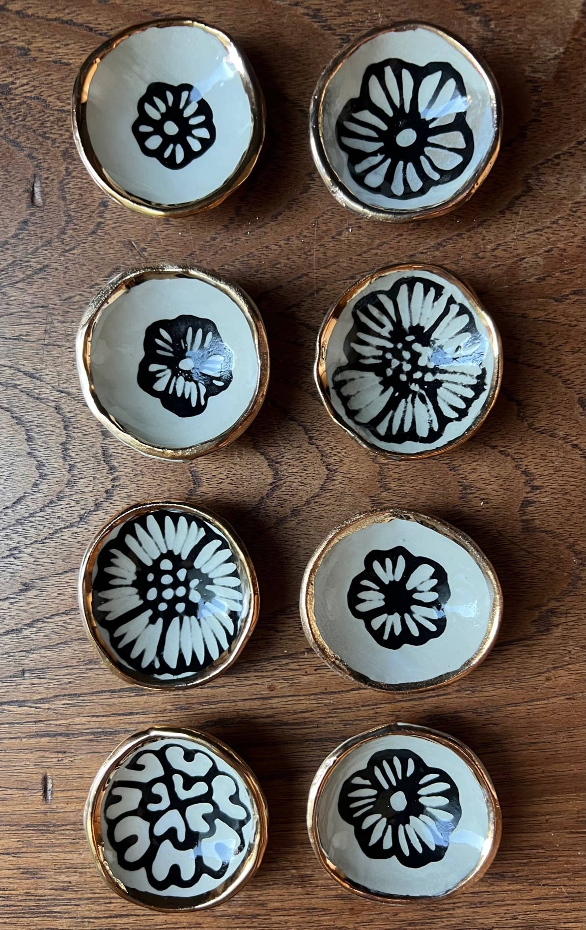 Handmade Stoneware Ceramic Round Trinket Dishes – Floral with 22kt Gold Accents Each of these pottery trinket dishes is handcrafted from durable stoneware and features delicate, hand-drawn floral designs, finished with luxurious 22kt gold accents. No two dishes are exactly alike—each one is a unique work of art. You'll receive a beautiful assortment of different floral motifs, perfect for holding rings, small jewelry, or other treasures.