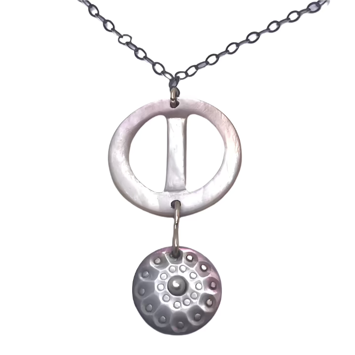 Antique Victorian Shell Button and Buckle, silver ball center and oxidized silver chian.