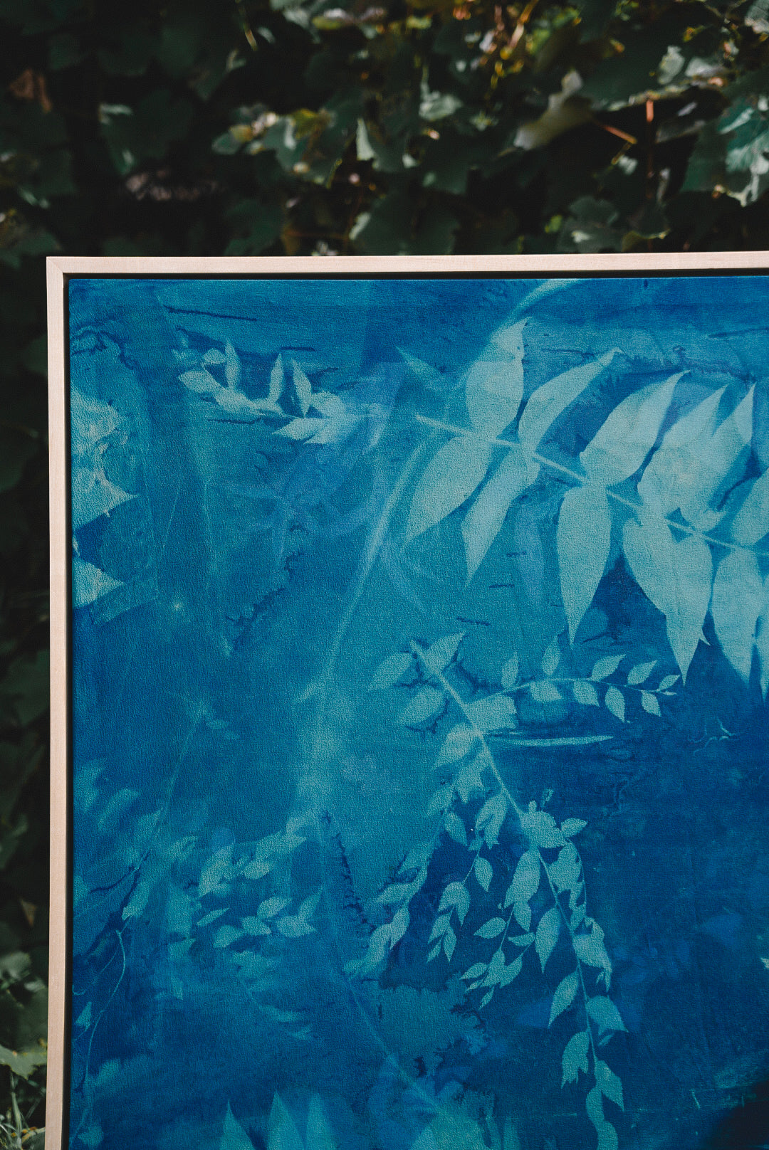 Cyanotype and mixed media on silk framed in maple float frame