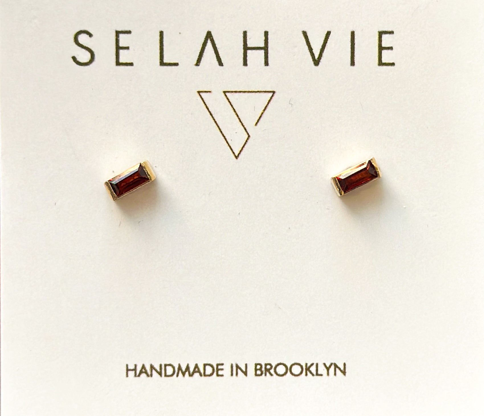 14K Garnet Baguette Studs handmade by Selah Vie Jewelry in NYC.