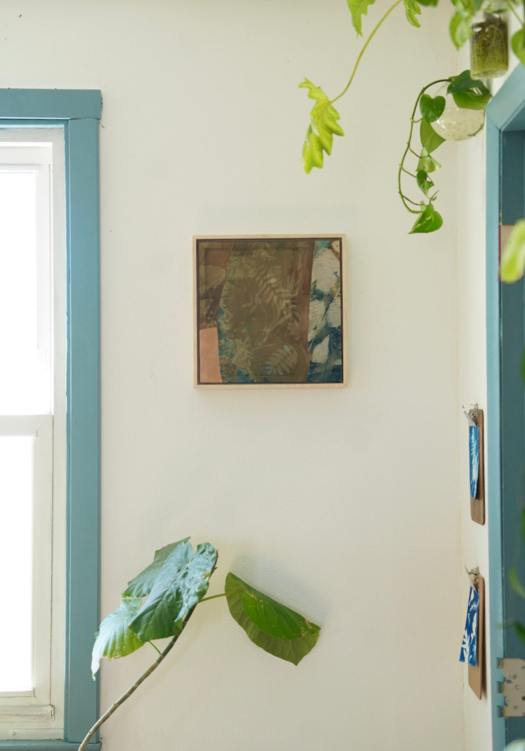 Cyanotype and mixed media on silk framed in maple float frame