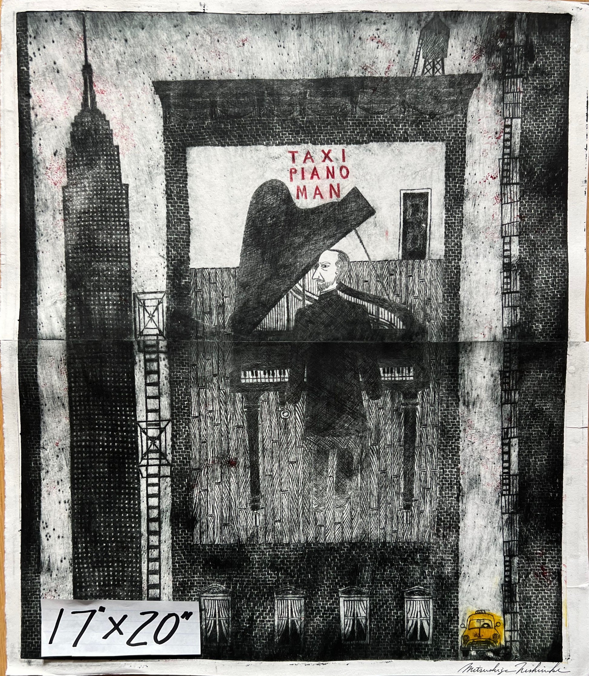 Original and signed by artist. Mitsushige is a self-trained etching artist. Early travels in charge of European business for a Japanese industrial company, followed by postgraduate studies in graphic design in Arizona and working as a graphic designer in NYC, inform his singular, humorous images of Europe and the USA created back home in Tokyo