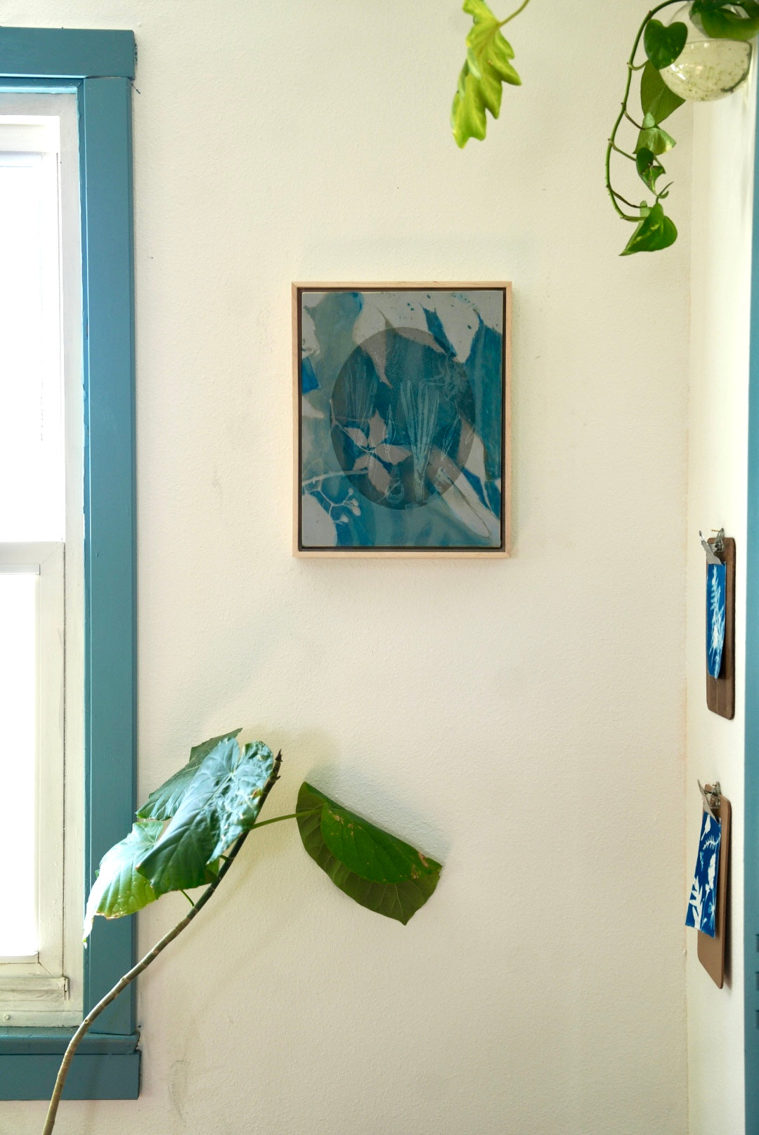 Cyanotype and mixed media on silk framed in maple float frame