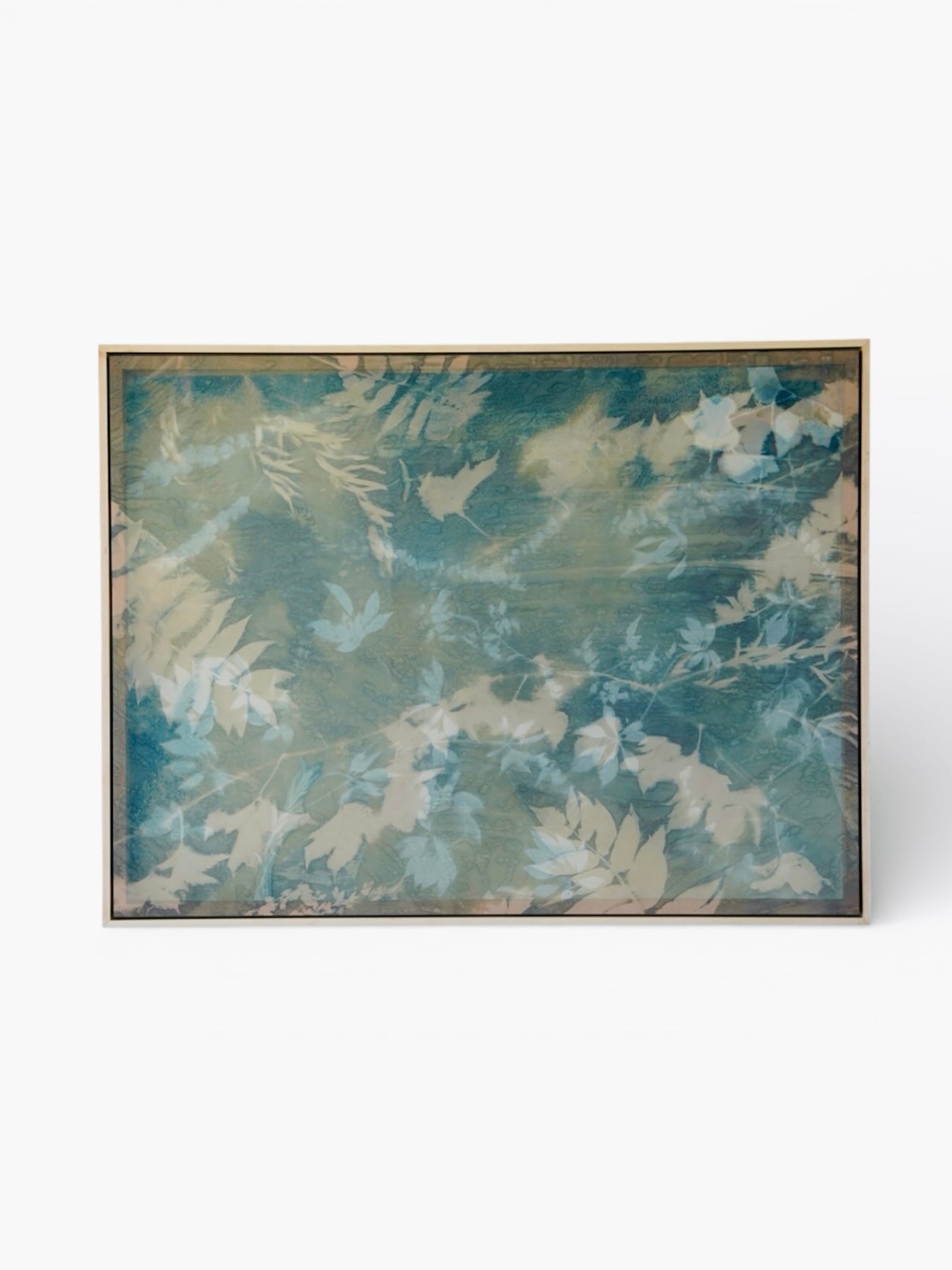 Cyanotype and mixed media on silk framed in maple float frame