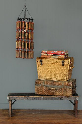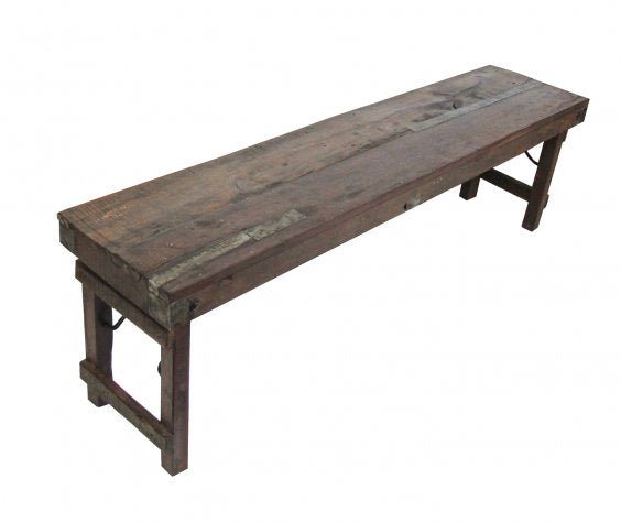 Reclaimed wood bench with folding legs and metal brace. Each bench will differ in patina and condition and many will feature metal patches.